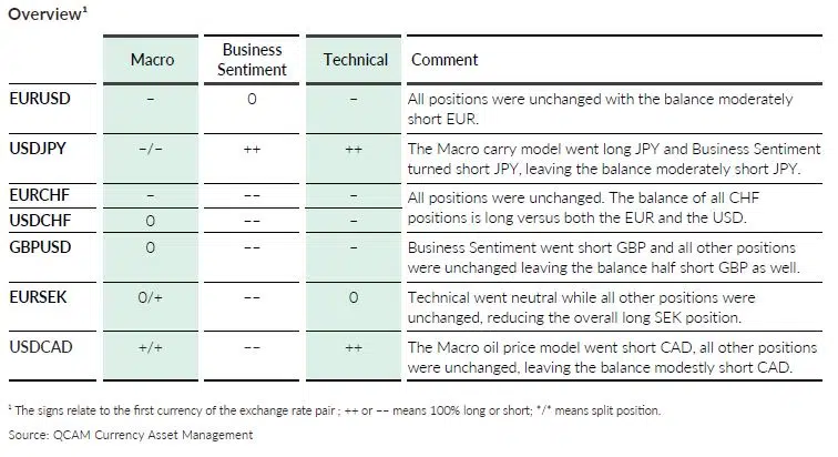 There have been several position changes since the last QCAM MONTHLY. The discretionary Macro positions all remained unchanged but the Macro carry model went long JPY and the Macro oil price model went short CAD. Business Sentiment turned short both JPY and GBP and is on balance neutral versus the USD. Finally, Technical went neutral SEK. As a result, the balance of all USD positions shifted from neutral to a small long with a mix of longs versus the EUR, the JPY, the GBP and the CAD and short versus the CHF. The overall EUR position is short versus both the CHF and the SEK.