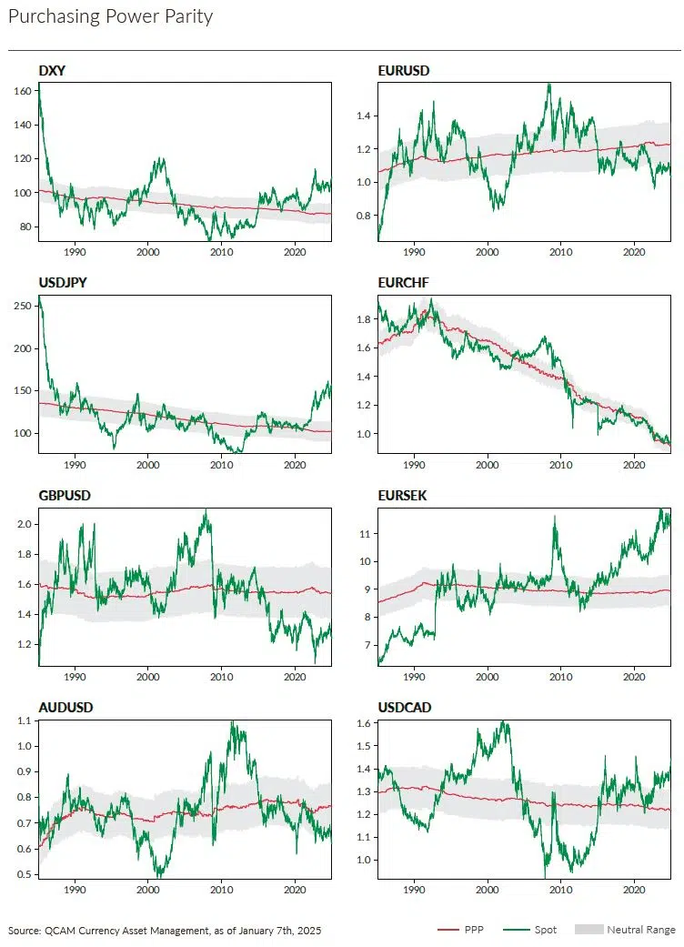 The USD DXY gained 2.6% in December following +5.2% in October and November. USD strength was broad-based versus both all other major currencies as well as most EM currencies. Net long speculative USD positions increased further and stand at a historical high with EUR, CHF, CAD and NZD most oversold. Short-term interest rates continued to move lower but some forwards price less future rate cuts than a month ago, notably for the Fed. The cost of forward hedging versus the USD has declined further but remains expensive for JPY and CHF. Actual and implied FX volatilities were mixed but on balance relatively stable and close to their historical averages with USDJPY well above. PPP changes continue to converge as inflation moderates but differences to actual exchange rate levels remain large and the USD continues to be overvalued versus all major currencies.