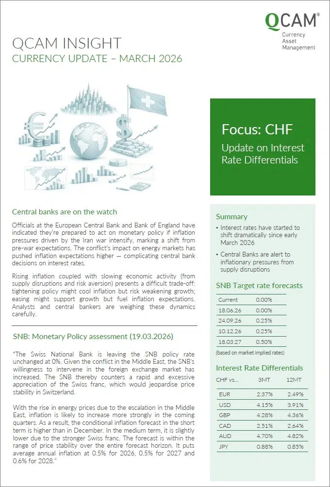 This QCAM INSIGHT – Currency Update March 2026 provides you a concise overview of current CHF interest rate spreads and movements. Understanding these developments is essential for assessing the impact on treasury operations, liquidity management, and strategic positioning amid rapidly changing market conditions.
